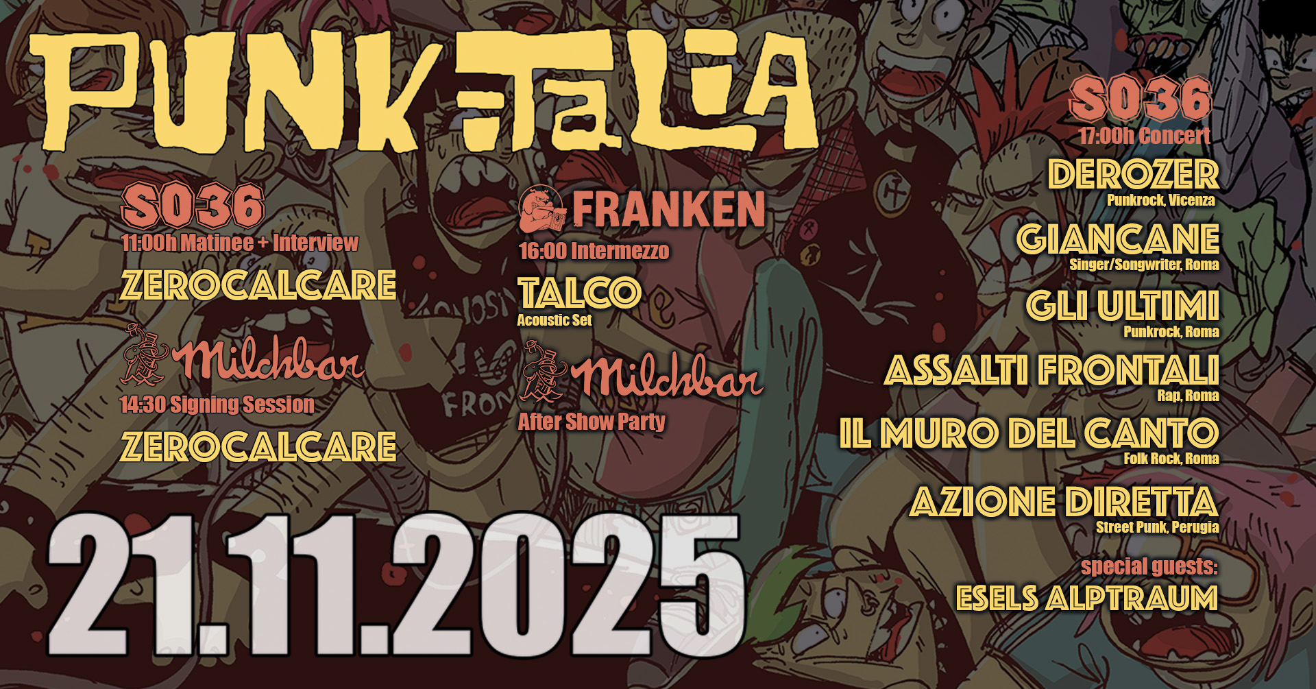 Zerocalcare, Derozer, Gli Ultimi, Assalti Frontali, Il Muro del Canto, Azione Diretta, Esels Alptraum, Talco (acoustic set) Doors: 11:00Zerocalcare Matinee:...