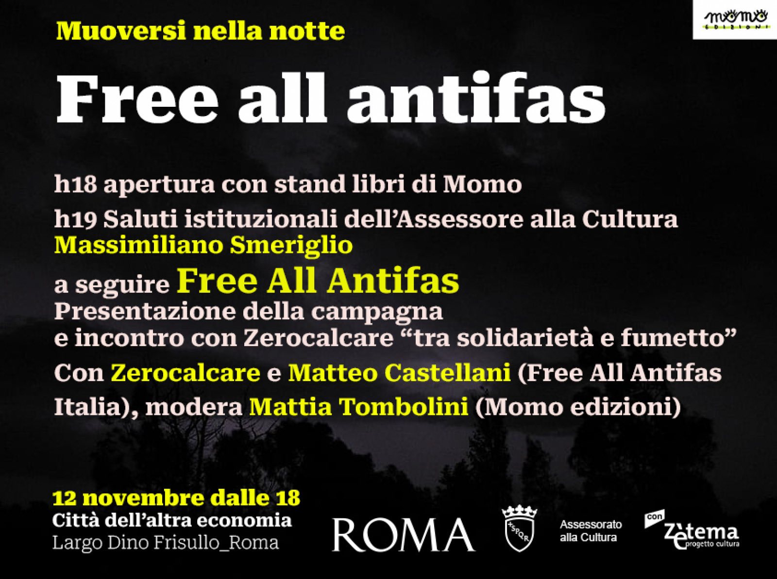 Mercoledì 12 novembre alla Città dell’altra economia un evento all’interno della rassegna “Muoversi nella notte” sulla campagna Free All Antifas....